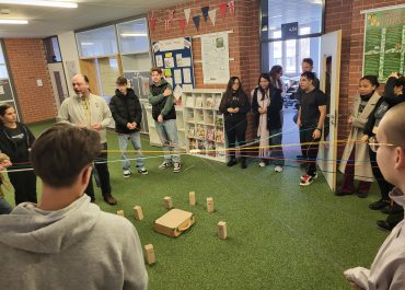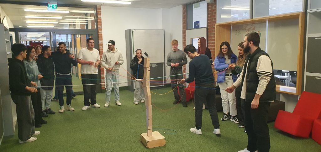 Seit 01.10.2024 ist Herr Oliver Sailer als Jugendsozialarbeiter an der Berufsschule Bad Wörishofen tätig. Zum gegenseitigen Kennenlernen führte er in allen Klassen Kooperationsspiele durch, welche die Schülerinnen und Schüler engagiert und mit Begeisterung absolvierten. Zu sehen ist hier der sogenannte Power of Tower oder Fröbelturm, welcher nur durch gute Kommunikation und Zusammenarbeit im Team aufgebaut werden kann. Selbst wenn es nicht gelang, den Turm ganz aufzubauen, lernten die Schülerinnen und Schüler in jedem Fall etwas über ihre Klassengemeinschaft.