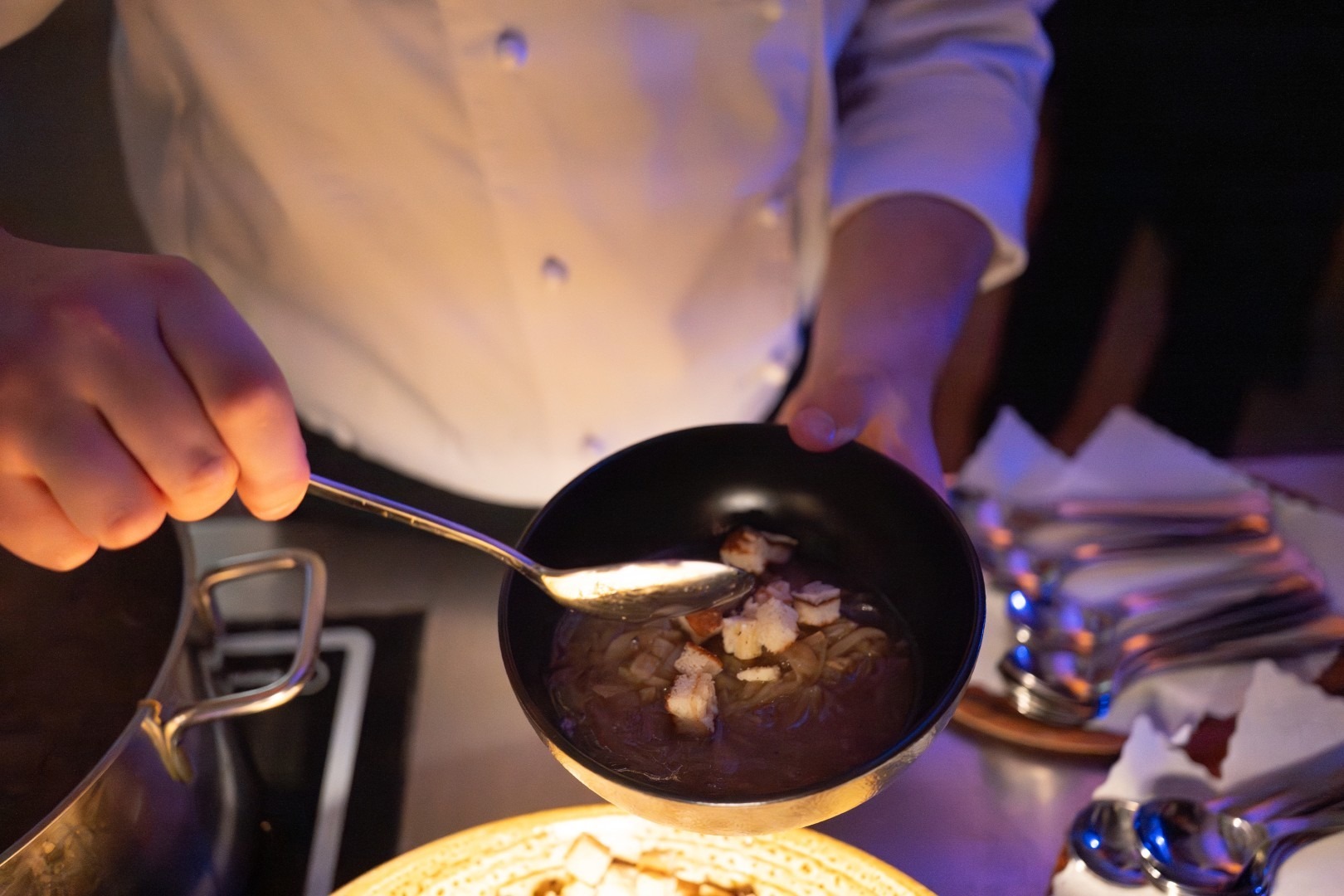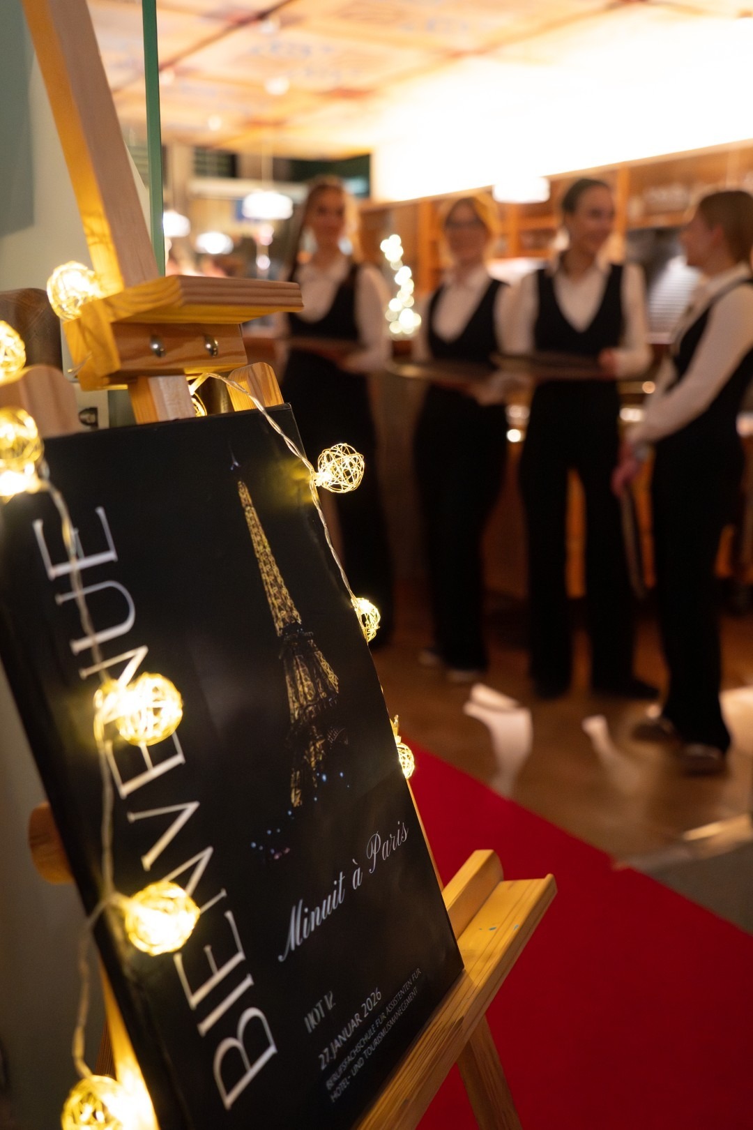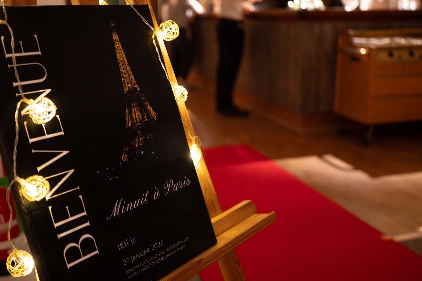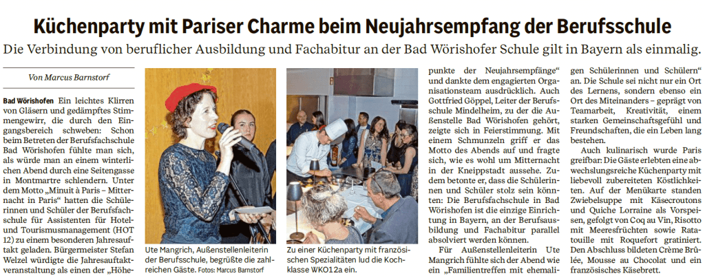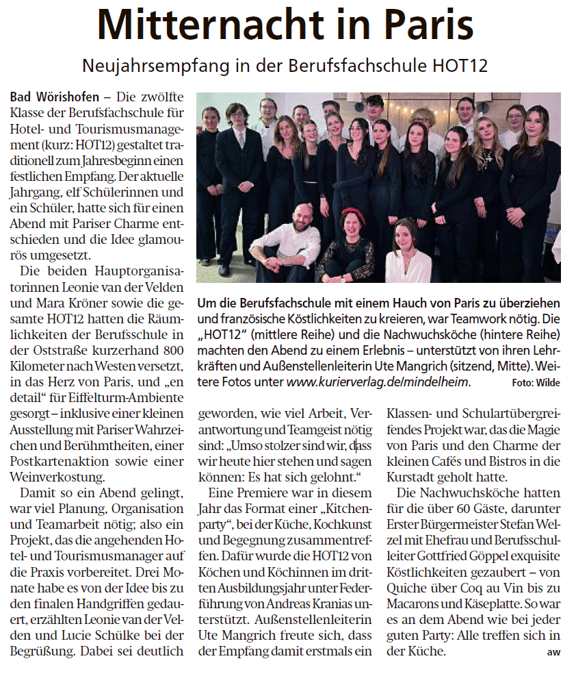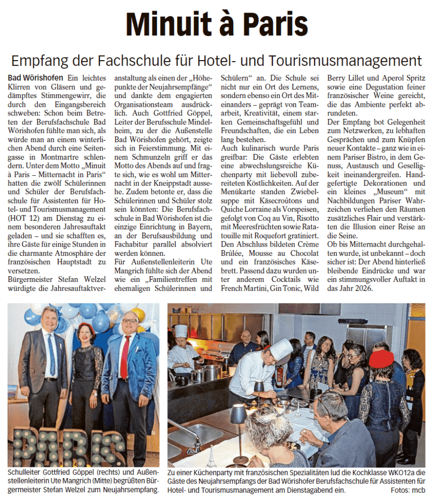 Am Dienstag, 27.01.26, fand der von der HOT12  (Klasse der Berufsfachschule Hotel- und Tourismusmanagement) organisierte Neujahrsempfang unter dem Motto „Minuit à Paris“ statt und sorgte für eine ganz besondere Pariser Atmosphäre. Ein Highlight des Abends war die Kitchenparty der WKO12a (Koch-Klasse der Berufsschule), die mit einer kulinarischen Vielfalt das Programm abrundete.