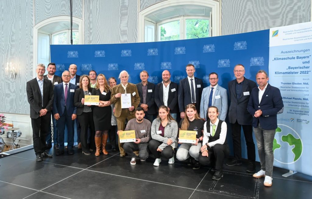 Die bayerischen Staatsminister Michael Piazolo (Kultus) und Thorsten Glauber (Umwelt) haben am Mittwoch, 28. September 2022 auf Schloss Nymphenburg die ersten „Klimaschulen“ Bayerns ausgezeichnet. Wir durften mit einer Delegation aus Schulleitung, Klimateamlehrkräften und KlimasprecherInnen dort teilnehmen und wurden gleich mit zwei Urkunden ausgezeichnet