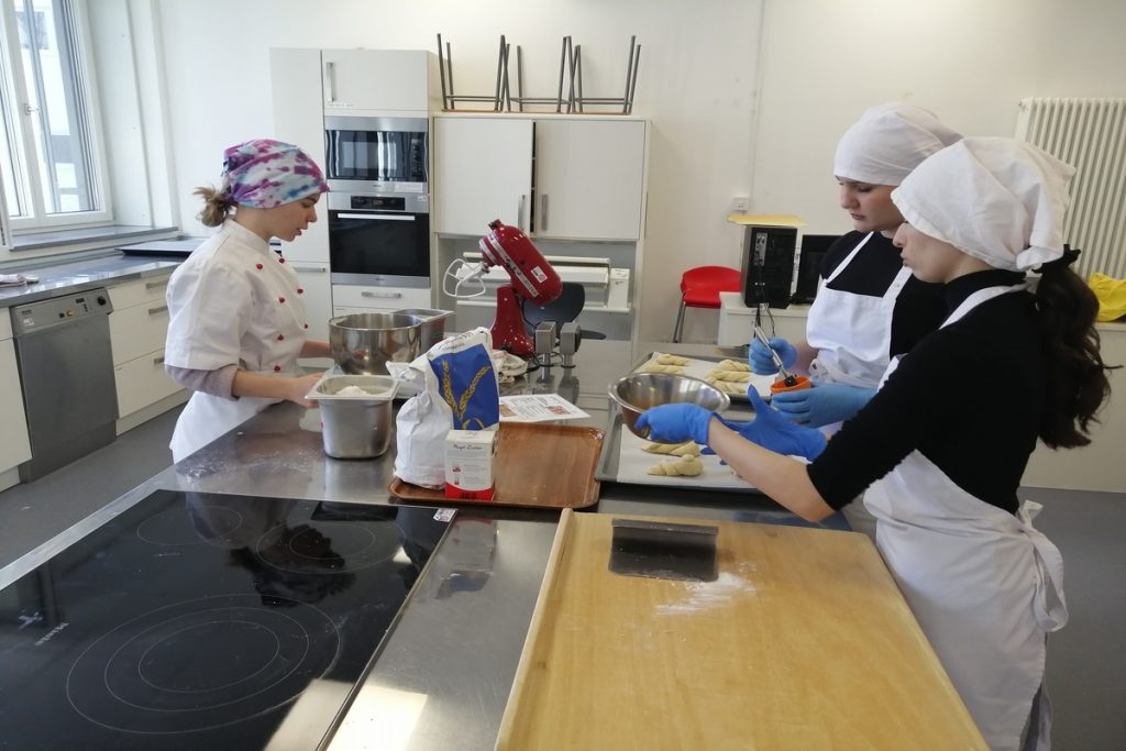 die MittelschülerInnen wurden von unseren EV-SchülerInnen der Klasse 11 herzlich und souverän empfangen und haben in kleinen Gruppen gemeinsam passend zum baldigen Osterfest Überraschungs-Rührteigeier, Quarkölteig-Häschen und Mini-Pizzen gebacken.