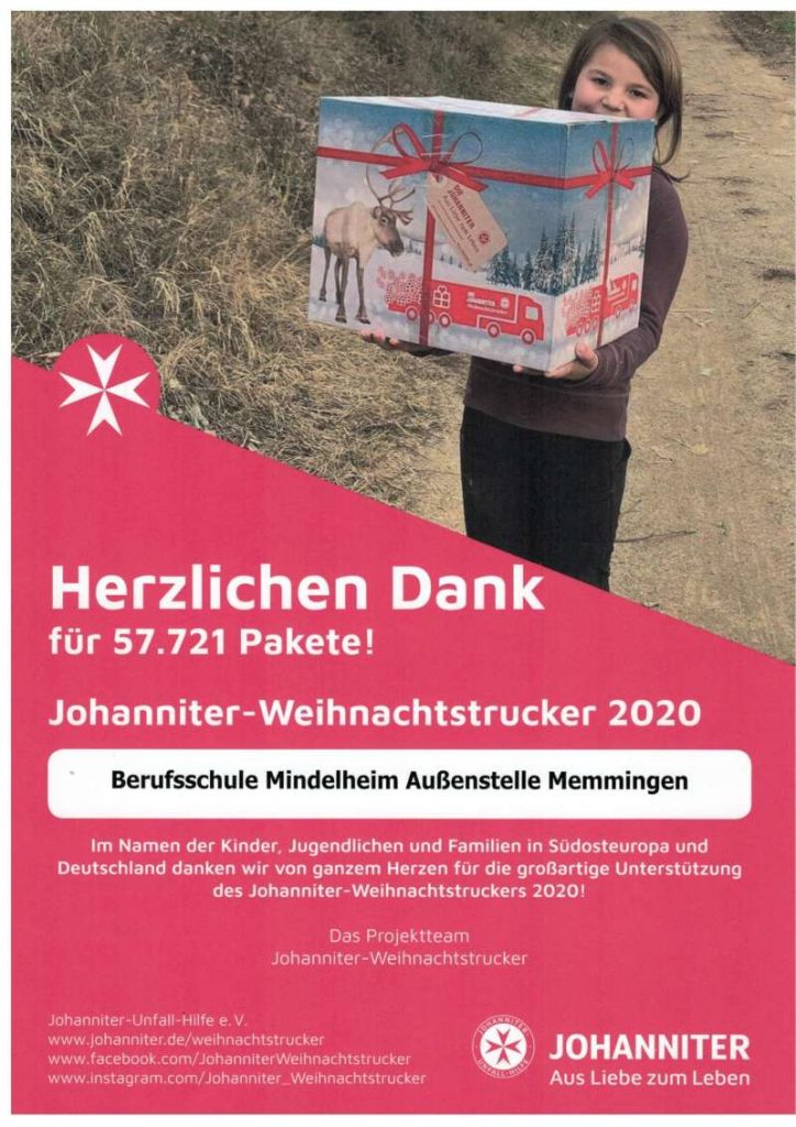 57.721 Pakete wurden insgesammt im Rahmen der Johaniniter-Weihnachtstrucker-Aktion abgegeben. Unsere Schule ist stolz als offizielle Sammelstelle in Memmingen aktiv dazu beigetragen zu haben. Die vorgegebene Packliste diente als Einkaufsliste für die Schüler/innen – Jeder einzelne konnte so einen großen oder kleinen Beitrag leisten und Teil der Spendenaktion werden.