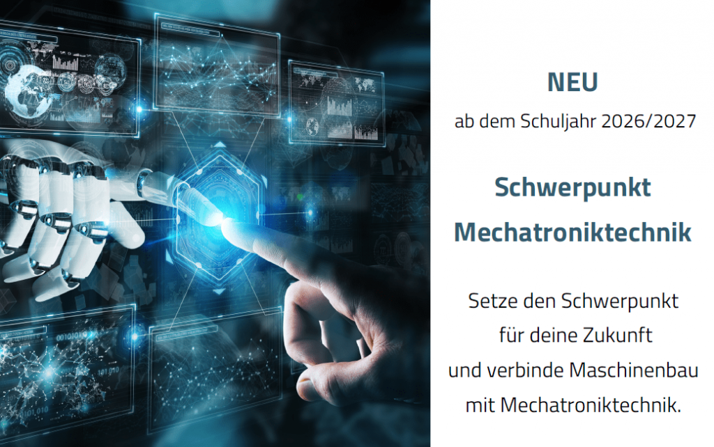 Wir bereiten unsere Absolventinnen und Absolventen bestmöglich auf zukünftige Anforderungen vor und bieten im Schuljahr 2026/2027 erstmals den Schwerpunkt Mechatroniktechnik an.